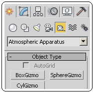 Şekil 9: Döndürülmüş odunlar Şekil 10: Odun yığını2.ATEŞ EFEKTİNİN OLUŞTURULMASI Ateş Efektini (Fire Effect) oluşturmak için aşağıdaki sıra takip edilir. 1. Efekt objesi çizmek için Create ►Helpers ►Atmospheric Apparatus ►SphereGizmo yolu kullanılır (Şekil 11). Şekil 11:Efekt çizim yolu Şekil 12:Gizmo parametreleri Şekil 13:Küre gizmosu2. SphereGizmo düğmesine tıklanarak ekrana Şekil 12’deki ölçülerde yarım küre çizilir Yarım küre oluşturmak için Hemisphere onay kutusu işaretlenmelidir. Gizmo Scale (Ölçek)komutuyla Z ekseni yönünde uzatılabilir (Şekil 13). Şekil 14:Odunlar ve gizmo Şekil 15:Add Atmospheres diyalog kutusu