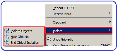 ISOLATE (Objeleri İzole Et) 1.TANITIM Bazı kalabalık resimler üzerinde çalışırken, özellikle 3d çizimlerinde rahat çalışmak için bazı çizimlerin gizlenmesi gerekebilir. Isolate komutu bu gizleme görevini yapmaktadır. Çalışma bittikten sonra gizlenen objeler tekrar görüntülenirler. Isolate komutuna aşağıdaki yollardan biriyle girilir.