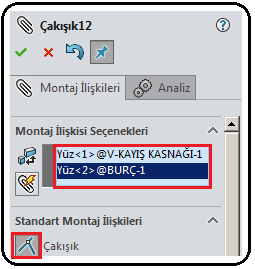 komut düğmesine tıklanır veya Ekle (Insert) menüsünden Montaj İlişkisi (Mate) komutu verilir ve aynı isimli özellik yöneticisi görüntülenir (Şekil 1).