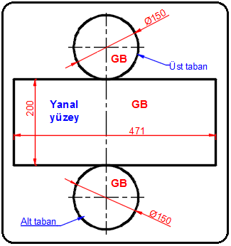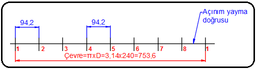 1.DİK SİLİNDİRİN AÇINIMININ ÇİZİLMESİ Şekil 1’de ön ve üst görünüşü verilmiş silindir yatay izdüşüm düzlemine dik, diğer izdüşüm düzlemlerine paraleldir. Bundan dolayı yanal ayrıtlar tam boyda alt ve üst taban gerçek büyüklüktedir. Silindirin açınımını çizmek için aşağıdaki işlem sırası uygulanır: Şekil 1:Açınımı yapılacak silindir ve görünüşleri1. Önce silindirin yanal yüzeyinin açınımı yapılacaktır. Yataya paralel bir açınım yayma doğrusu çizilir ve üzerinde bir başlangıç noktası alınır. Başlangıç noktasına göre tabanın çevre uzunluğu açınım yayma doğrusu üzerinde işaretlenir (Şekil 2). Çevre uzunluğu Çevre=πxD=3,14x150=471 formülüyle hesaplanır. Şekil 2:Açınım yayma doğrusu 2.Silindirin yüksekliğini temsil eden yanal ayrıt uzunlukları açınım yayma doğrusuna dik olarak çizilir (Şekil 3). 3.Yanal yüzeyin açınımını elde etmek için doğruların uçları birleştirilir. Tam açınım elde etmek için taban daireleri ilave edilir (Şekil 4). Şekil 3:Yanal ayrıt doğruları Şekil 4:Silindirin tam açınımı 2.EĞİK KESİLMİŞ SİLİNDİRİN AÇINIMININ ÇİZİLMESİ Şekil 5’ de ön ve üst görünüşü verilmiş eğik kesilmiş silindir yatay izdüşüm düzlemine dik, diğer izdüşüm düzlemlerine paraleldir. Bundan dolayı yanal ayrıtlar tam boyda alt taban gerçek büyüklüktedir. Silindirin açınımını çizmek için aşağıdaki işlem sırası uygulanır: Şekil 5:Eğik kesilmiş silindir ve görünüşleri Şekil 6:Bölüntüler 1. Silindirin tam açınımını elde etmek için elips şeklindeki eğik yüzeyin gerçek büyüklüğünün bulunması gerekir. Üst görünüş olan daireyi 8 eşit parçaya bölelim ve ön görünüşe taşıyalım. Bölüntü noktalarını numaralandıralım (Şekil 6). 2. Eğik yüzeyin gerçek büyüklüğünü bulmak için döndürme metodu kullanılacaktır. Eğik yüzeyin çizgi görüntüsü yatay düzleme paralel oluncaya kadar döndürülür. Döndürme merkezini bulmak için Şekil 7’de görüldüğü gibi ön görünüşün tabanından sola doğru bir doğru çizilir. Eğik yüzeyin çizgi görüntüsünden aynı hizada bir doğru daha çizilir ve önceki doğru kestirilir. İki doğrunun kesim yeri merkez noktası kabul edilir. 3. Pergel merkez noktasına batırılarak eğik yüzeydeki noktalar yatay çizgi üzerine taşınır ve numaralandırılır (Şekil 8). Şekil 7:Merkez noktası Şekil 8:Döndürülmüş çizgi görüntüsü 4. Döndürülmüş çizgi görüntüsünden aşağı tarafa dik taşıma çizgileri çizilir. Üst görünüşten sol tarafa yatay taşıma çizgileri çizilir ve aynı numaralı dik doğrularla kestirilerek köşe noktaları bulunur (Şekil 9).Bulunan köşe noktaları numaralandırılır. Şekil 9:Noktaların bulunması5. Bulunan noktalar birleştirilerek elips şeklindeki eğik yüzeyin gerçek büyüklüğü bulunur (Şekil 10). Şekil 10:Eğik yüzeyin gerçek büyüklüğünün bulunması 6. Önce silindirin yanal yüzeyinin açınımı yapılacaktır. Yataya paralel bir açınım yayma doğrusu çizilir ve üzerinde bir başlangıç noktası alınır. Başlangıç noktasına göre tabanın çevre uzunluğu açınım yayma doğrusu üzerinde işaretlenir (Şekil 11). Çevre uzunluğu Çevre=πxD=3,14x240=753,6 formülüyle hesaplanır. Şekil 11:Açınım yayma doğrusu 7. Açınım yayma doğrusu 8 eşit parçaya bölünür (Şekil 12).Bir parçanın uzunluğu 94,2 ölçüsü uzunluğundadır. Şekil 12:Açınım yayma doğrusunda bölüntüler 8. Silindirin ön görünüşündeki yüksekliği temsil eden bölüntü çizgilerinin uzunluğu, açınım yayma doğrusu üzerindeki bölüntülerden dik olarak çizilir (Şekil 13). Saç parçaları kıvrıldığı veya büküldüğü zaman başlangıç ve bitiş kenarları aynı çizgiyle ve numarayla ifade edilir (1-1). Burada dikkat edilecek husus bölüntü sayısıdır. Açınımlarda dikey çizgi sayısı bir adet fazla olur. Şekil 13:Açınım yayma doğrusuna dik bölüntü çizgileri 9. Doğruların uç noktaları pistole yaylarıyla birleştirilir. Düz kısımlar doğrularla birleştirilir. Fazlalıklar silinerek silindirin yanal yüzeyinin açınımı tamamlanmış olur (Şekil 14). Şekil 14:Silindirin yanal yüzeyinin açınımı 10. Alt ve üst tabanlar ilave edilerek tam açınım çizimi tamamlanmış olur (Şekil 15). Şekil 15:Eğik kesilmiş silindirin tam açınımı